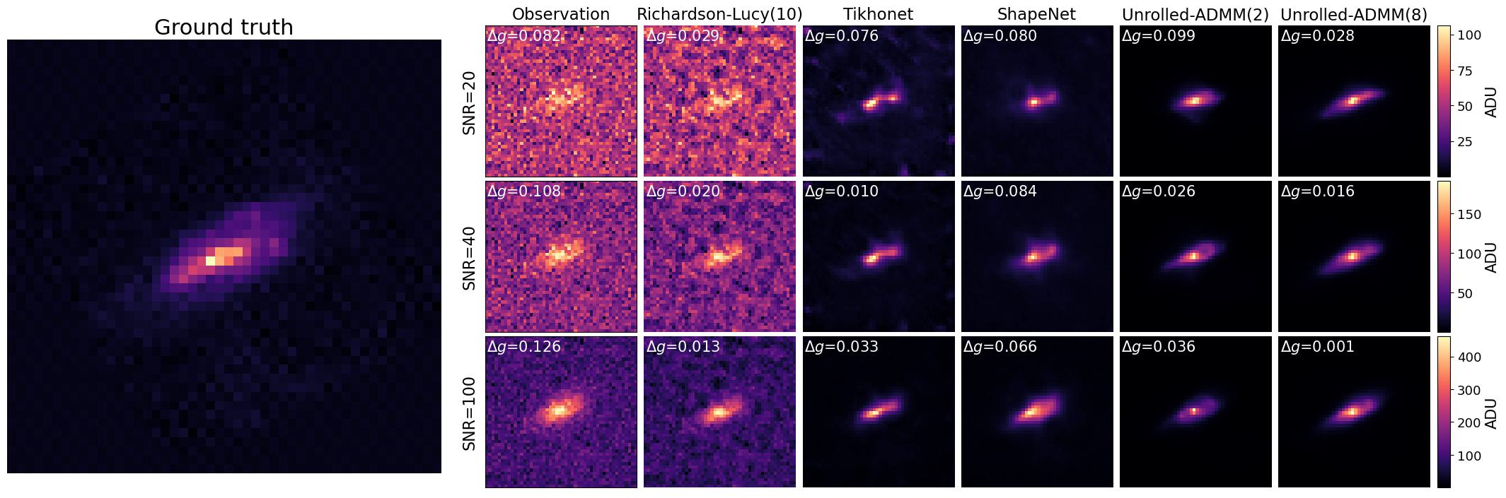 Removing optical and atmospheric blur from galaxy images significantly improves galaxy shape measurements for weak gravitational lensing and galaxy evolution studies. This ill-posed linear inverse problem is usually solved with deconvolution algorithms enhanced by regularisation priors or deep learning. We introduce a so-called "physics-informed deep learning" approach to the Point Spread Function (PSF) deconvolution problem in galaxy surveys. We apply algorithm unrolling and the Plug-and-Play technique to the Alternating Direction Method of Multipliers (ADMM), in which a neural network learns appropriate hyperparameters and denoising priors from simulated galaxy images. We characterise the time-performance trade-off of several methods for galaxies of differing brightness levels as well as our method's robustness to systematic PSF errors and ablations. We show an improvement in reduced shear ellipticity error of 38.6% (SNR=20)/45.0% (SNR=200) compared to classic methods and 7.4% (SNR=20)/33.2% (SNR=200) compared to modern methods.